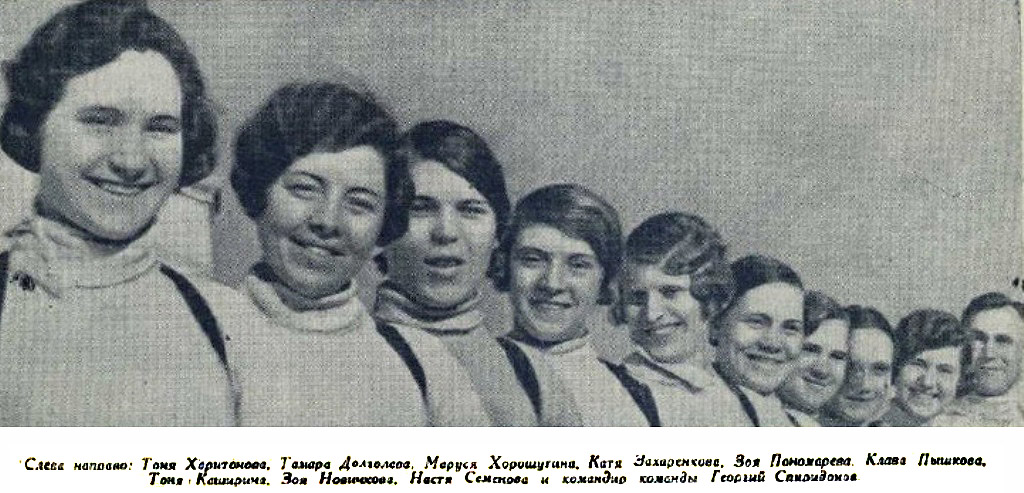 10 женщин-физкультурниц Московского электрокомбината им. Куйбышева — Семенова Анастасия (комсорг), Захаренко Екатерина, Каширина Антонина, Константинова Валентина, Новичкова Зоя, Пышкова Клавдия, Пономарева Зоя, Харитонова Татьяна, Хорощутина Мария и Долганова Тамара (корреспондент газеты «Рабочая Москва») с командиром Спиридоновым