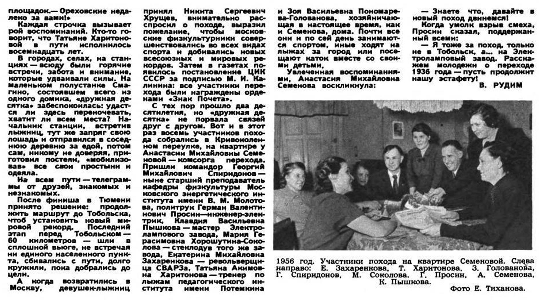 В № 3 «Огонька» за нынешний год была напечатана корреспонденция «Поход пятерых комсомольцев» — о мужском лыжно-пешем переход» Москва — Комсомольск-на-Амуре, вызвавшая оживленные отклики читателей. Один из них, Д. А. Андреев из Беломорска, напомнил о другом лыжном переходе 1936 года — женском, и попросил рассказать на страницах журнала об этом походе и его участницах.