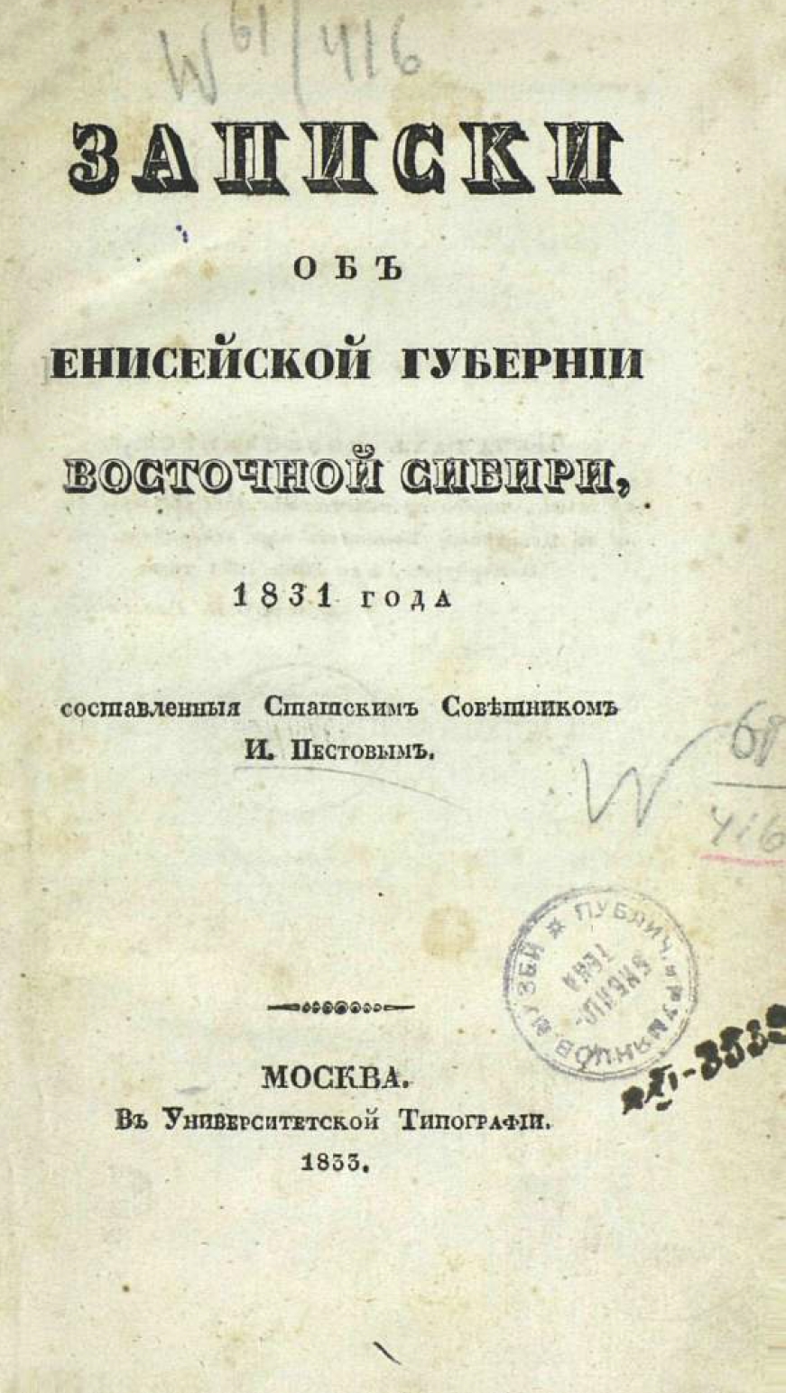 Пестов И.С., "Записки об Енисейской губернии Восточной Сибири, 1831 года" / составленные статским советником И. Пестовым. - Москва : Унив. тип., 1833. - [2], 298, X с., 13 л. ил., карт.