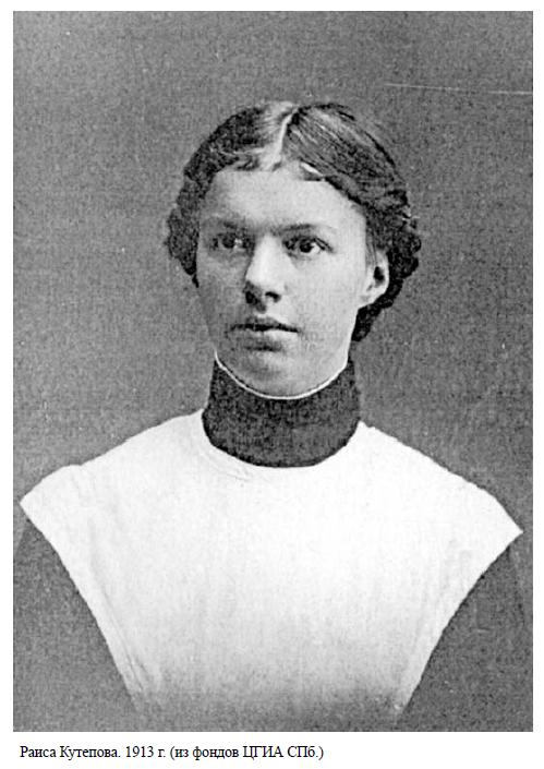 Раиса Кутепова отличалась прекрасными способностями, можно сказать, что она была и самая усердная в учебе из всех детей Кутеповых. После окончания седьмого класса Осташковской гимназии она закончила еще и восьмой «учительский» класс, который давал ей право преподавать в начальной школе. Вот ее аттестат за восьмой класс: «Предъявительница сего ученица VIII дополнительного класса Осташковской женской гимназии имени Б. И. Бенардаки Кутепова Раиса Павловна. Как видно из документов ея, дочь чиновника, православного вероисповедания, родившаяся 9 марта 1894 года, по окончании ею курса наук в Осташковской женской Гимназии поступила в VIII дополнительный класс в августе 1912 года для специального изучения русскаго языка и математики и находилась в оном по 1 июня 1913 года. При отличном поведении все практические учебныя занятия, установленныя для учениц VIII Дополнительнаго класса, выполнила весьма хорошо. В настоящем году при бывшем испытании учениц VIII дополнительного класса она, Кутепова Раиса, оказала нижеследующие познания: В предметах общеобязательных: в Законе Божием Отлично/пять/, в педагогике и дидактике: хорошо/четыре/, в начальном преподавании русскаго языка: хорошо/четыре/, в начальн. препод арифметике хорошо/ четыре/ В предметах специальных: в словесности – отличныя/ пять/ в математике хорошие/четыре/ в географии не обучалась.