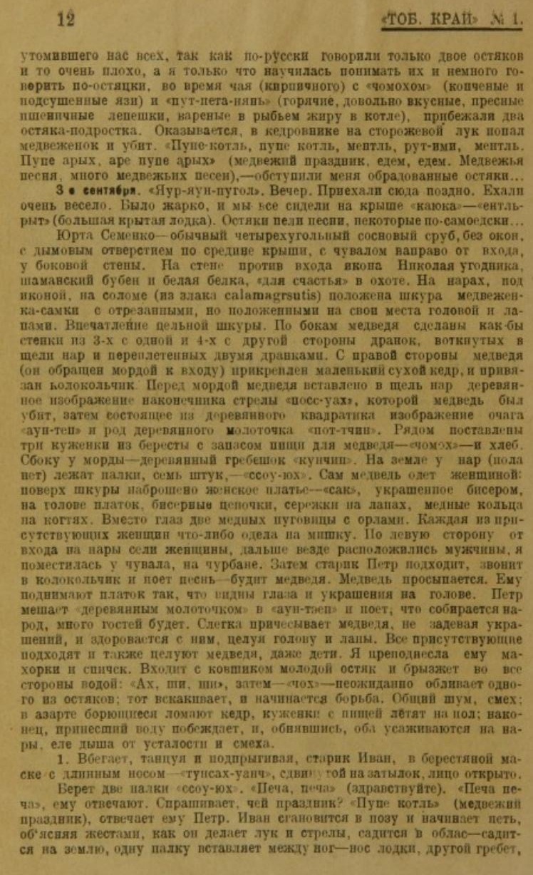 утомившего нас всех, так как по-русски говорили только двое остяков и то очень плохо, а я только что научилась понимать их и немного говорить по-остяцки, во время чая (кирпичного) с «чомохом» (копченые и подсушенные язи) и «пут-пета-нянь» (горячие, довольно вкусные, пресные пшеничные лепешки, вареные в рыбьем жиру в котле), прибежали два остяка-подростка. Оказывается, в кедровнике на сторожевой лук попал медвежонок и убит. «Пуне-котль, пупе котль, ментль, рут-ими, ментль. Пупе арых, аре пупе арых» (медвежий праздник, едем, едем. Медвежья песня, много медвежьих песен), — обступил меня обрадованные остяки...
