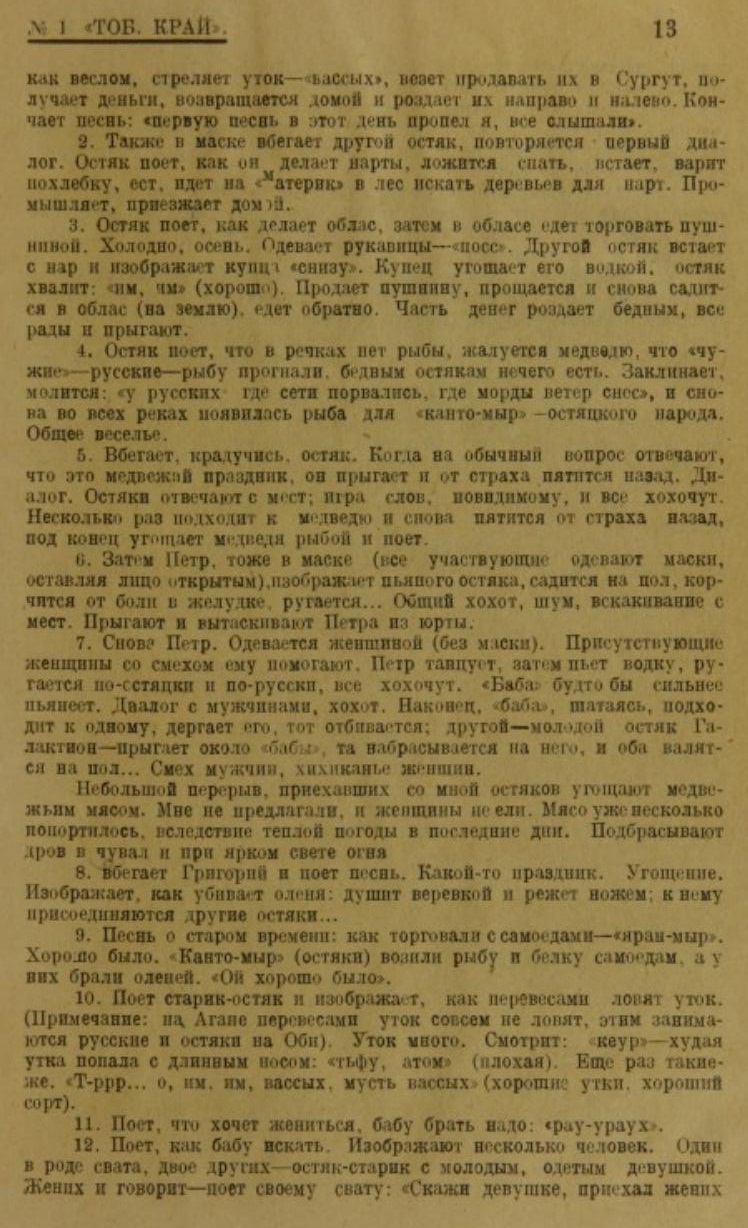 15. Два остяка Галактион и Степан. Степан одет бабой. Оба танцуют и поют. «Баба» кормит «мужа», ищет у него в голове. Галактион начинает ласкать «бабу»... остяки подают ему реплики, Галактион быстро на них отвечает, очень удачно повидимому. Общий хохот. Все вскакивают и прыгают.