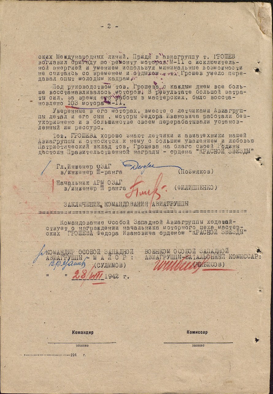 ... Придя в авиагруппу, тов. Грошев возглавил бригаду по ремонту моторов М-11. С исключительной энергией и умением, используя минимальные возможности, не считаясь со временем и отдыхом, тов. Грошев умело передавал опыт молодым кадрам. Под руководством тов. Грошева с каждым днем все больше восстанавливалось моторов.