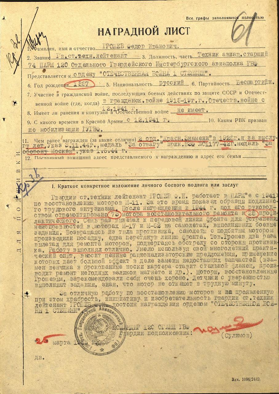 нения неисправностей в моторах М-17 и М-62 на самолётах, выполнявших боевые задания. Возвращаясь из тыла противника, самолеты с подбитыми моторами производили посадку, едва перетянув линию фронта. Тов. Грошев два раза вылетал для ремонта моторов, подвергаясь обстрелу со стороны противника. Работу выполнял отлично. Умело используя свой многолетний практический опыт, выносит ценные рационализаторские предложения, применение которых дает большой эффект в деле замены недостающих запчастей (взамен венчика в бракованные носки картера ставит стальной фланец, производит ремонт негодных валиков магнето и др. ). Моторы, восстановленные Грошевым, зарекомендовали себя очень хорошо. Летчики с уверенностью выполняют задания, зная, что мотор не откажет в трудную минуту»... *