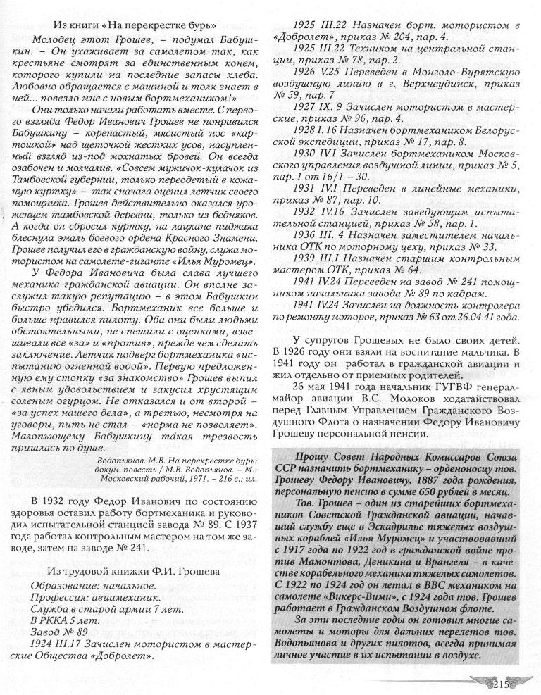 Тов. Грошев - один из старейших бортмехаников Советской Гражданской авиации, начавший службу еще в Эскадрилье тяжелых воздушных кораблей «Илья Муромец» и участвовавший с 1917 года по 1922 год в гражданской войне против Мамонтова, Деникина и Врангеля - в качестве корабельного механика тяжелых самолетов. С 1922 по 1924 год он летал в ВВС механиком на самолете «Викерс-Вими», с 1924 года тов. Грошев работает в Гражданском Воздушном флоте.