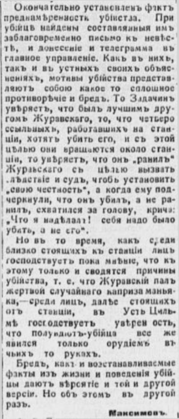 Но летом 1914 г. обстоятельства сложились так, что в руках у Журавского оказались фальшивые документы, позволявшие совершать разного рода аферы местному чиновнику, все это делалось с ведома начальника жандармского управления губернии. Опасаясь разоблачений и задумав "убрать" правдоискателя Журавского, они направили на него руку убийцы. Политический ссыльный, приставленный в качестве письмоводителя станции (признанный впоследствии невменяемым), утром 16 августа 1914 г. выстрелом из ружья убил А. В. Журавского. Так трагически закончилась жизнь подлинного энтузиаста исследования Крайнего Севера, неутомимого в поисках и экспериментах, страстного пропагандиста полярного земледелия, внесшего весомый вклад в развитие отечественной науки.