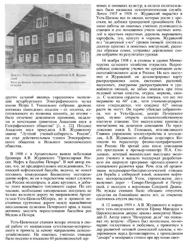 Из архивных материалов видно, с каким трудом приходилось А.В. Журавскому отстаивать эту идею. Его экспедиции, опыт по выращиванию сельскохозяйственных культур квалифицировались многими царскими чиновниками, как ненужная затея, связанная с бесполезной затратой государственных средств, как "сумасбродный авантюризм". И это еще самые мягкие оценки. Чтобы опровергнуть это предубеждение, А.В. Журавский в 1906-1910 гг. на крестьянских участках проводит исследования по выращиванию различных сельскохозяйственных культур "без технических усовершенствований, но с применением прополки и окучивания овощей". В 1910 г. на полях в Усть-Цильме вызрели ячмени, озимая и яровая рожь, овес, яровая пшеница (урожай сам 5.6), лен, конопля, картофель. Параллельно учитывались крестьянские посевы. Пример: посев – 2.4 ц, удобрение 30 т, снято зерна 27.5 ц. Проведен учет урожая бобов, брюквы, гороха, капусты, картофеля, моркови, пастернака, репы, редьки, свеклы, цикория. Поражает и набор культур и их урожайность: капусты до 56, картофеля от 45 до 63 т/га. Учет естественных лугов дал от 3.2 до 4.0 т сена с гектара. То есть уже тогда, при соблюдении простейших приемов выращивания – прополка, окучивание и внесение навоза, Журавский севернее 65° с.ш. получал урожаи, которым и сегодня могут позавидовать земледельцы средней и даже черноземной полосы России.