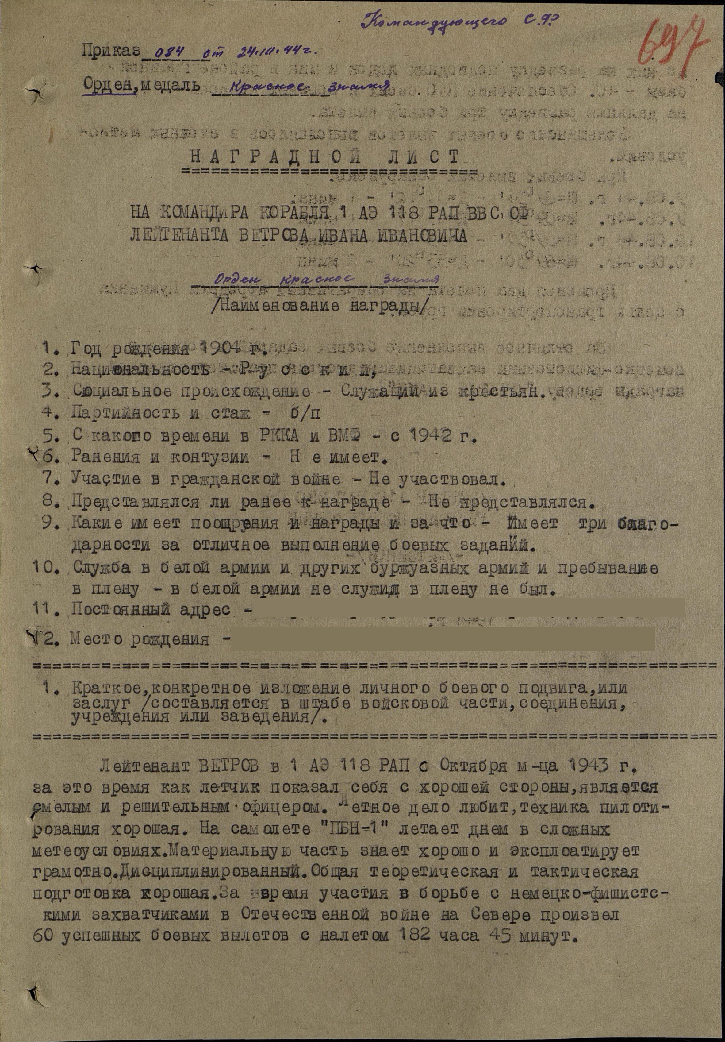За совершение 44-х боевых вылетов на ледовую разведку, поиск подводных лодок и мин противника, сопровождение конвоев 23 августа 1943 года, награжден орденом Красной Звезды. Орден вручен 7 октября 1943 года.