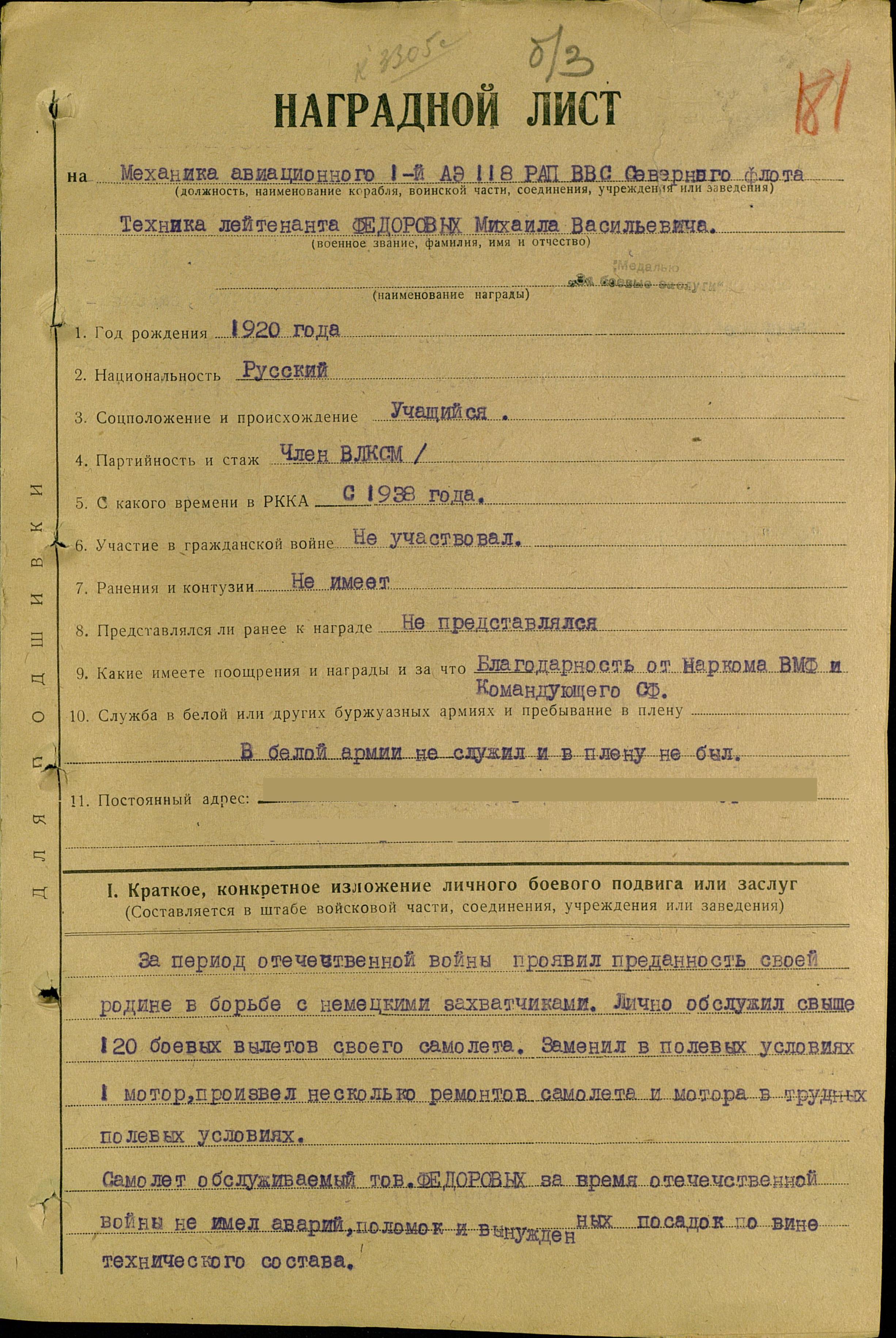 В 1943 г., выполнял боевую работу с оперативных аэродромов Иоганки, Моржовец, Нарьян-Мар и Амдерма в сложных метеоусловиях Севера. Имеет в общей сложности 44 боевых вылетов на ледовую разведку, поиск НЛ, ПЛ и мин противника на сопровождение конвоев.