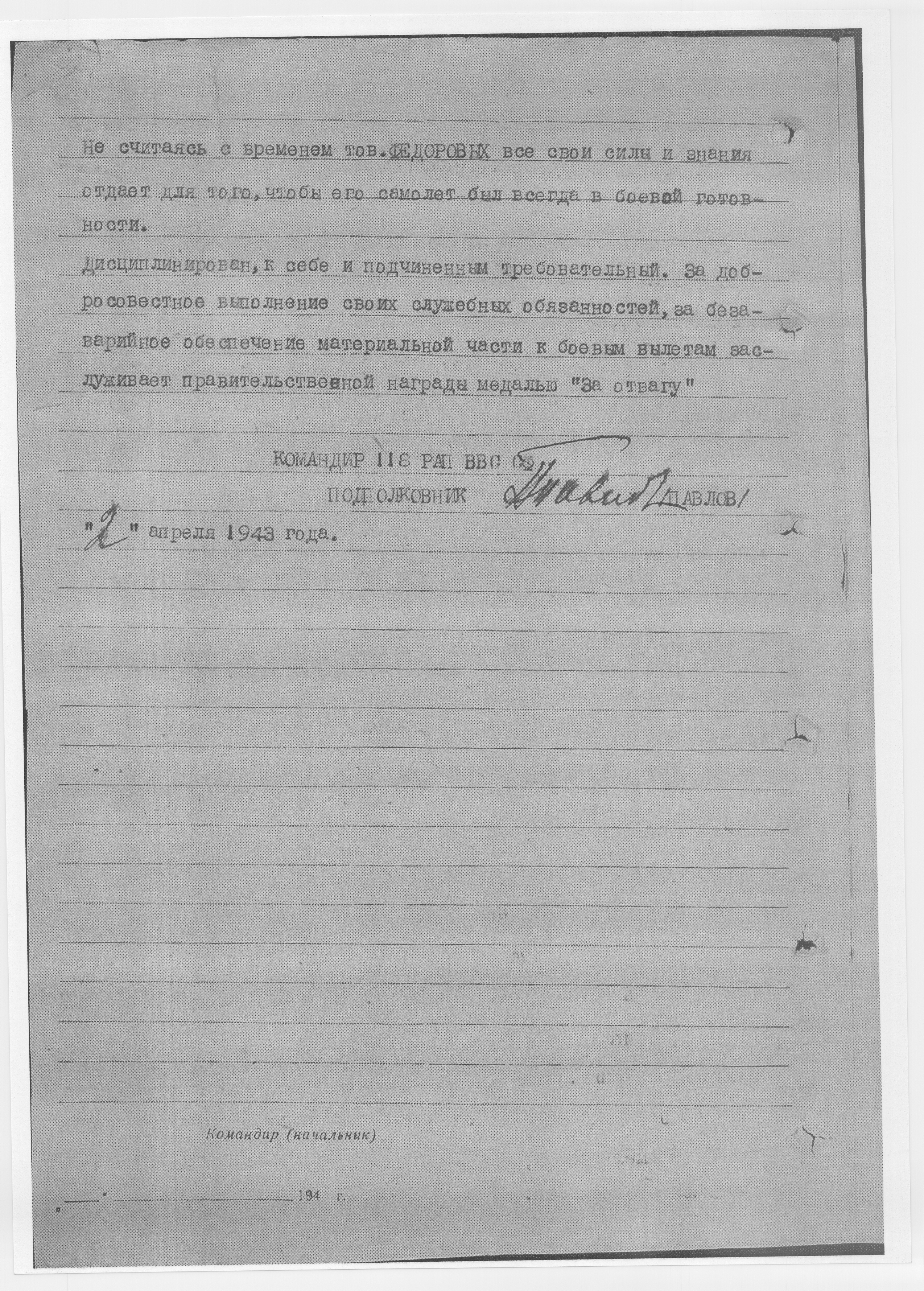 В 1943 г., выполнял боевую работу с оперативных аэродромов Иоганки, Моржовец, Нарьян-Мар и Амдерма в сложных метеоусловиях Севера. Имеет в общей сложности 44 боевых вылетов на ледовую разведку, поиск НЛ, ПЛ и мин противника на сопровождение конвоев.