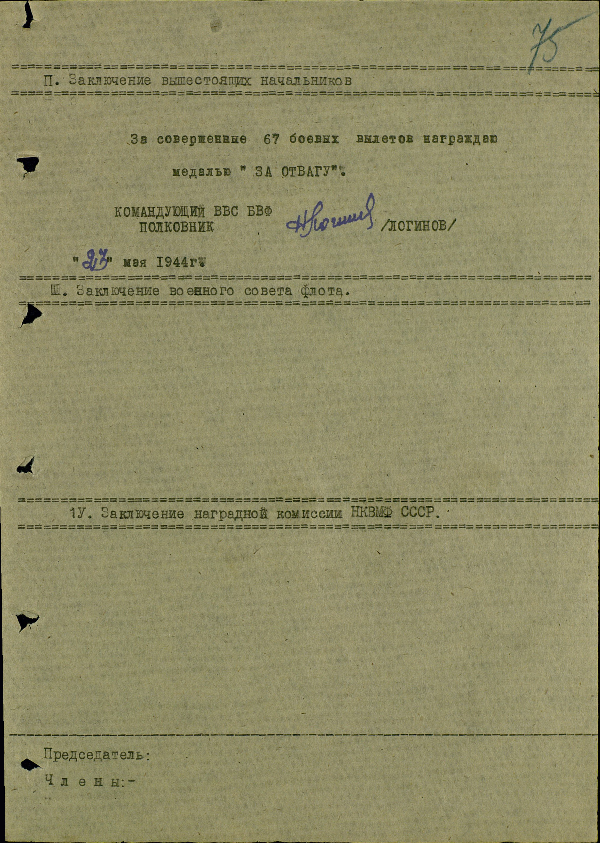 Наградной лист Филипцева на Орден Ленина - отказано (2 лист) и записка.