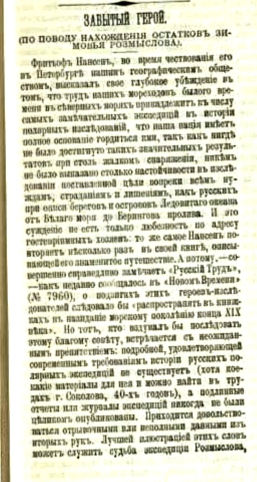 Можно считать, что Розмыслову принадлежит честь не только первого гидрографа Новой Земли, но и честь первого исследователя ее геологических и естественных особенностей. Из деяний таких самоотверженных русских людей по крупицам складывались наши современные знания об Арктике.