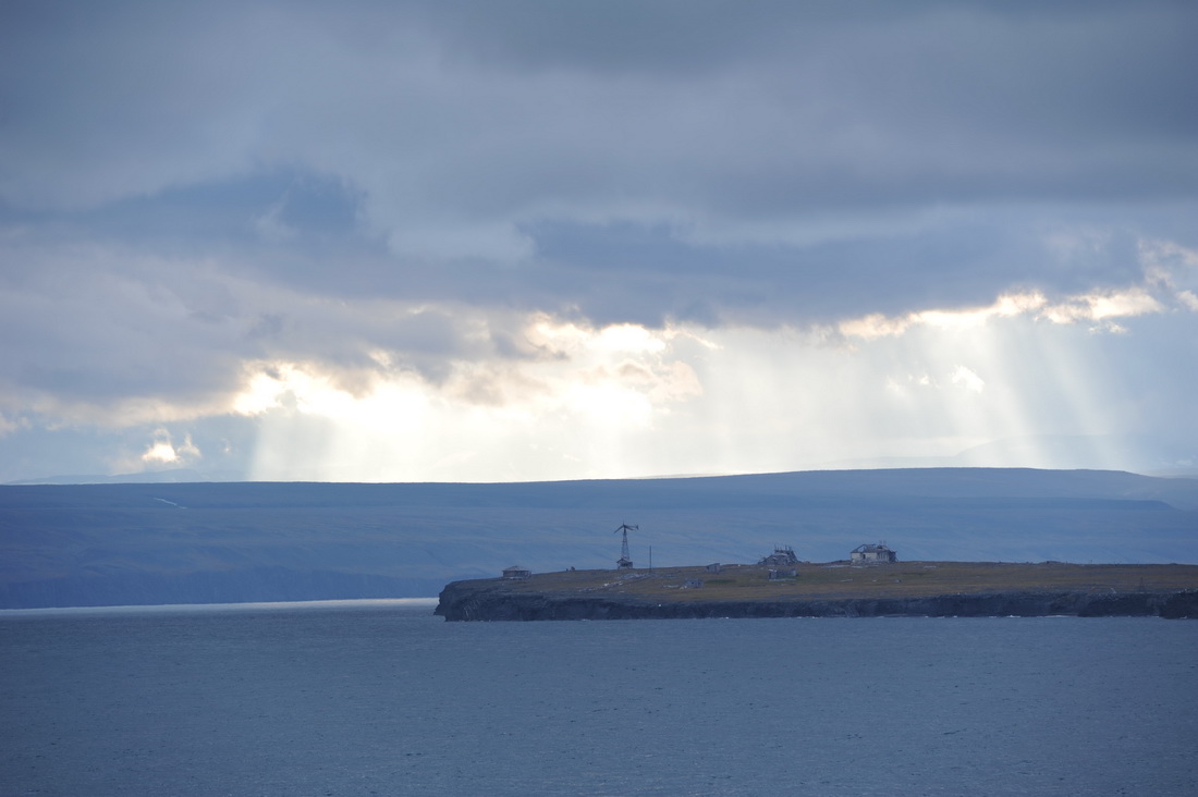 Мы в Карском море: на северной стороне мыс Выходной, на южной мыс Рок. Проходим траверз мыса Выходной; отчетливо видна метеостанция, бывшая метеостанция: два разрушающихся дома, большой ветряк, строения, служившие людям, нёсшим важную вахту в Арктике.
