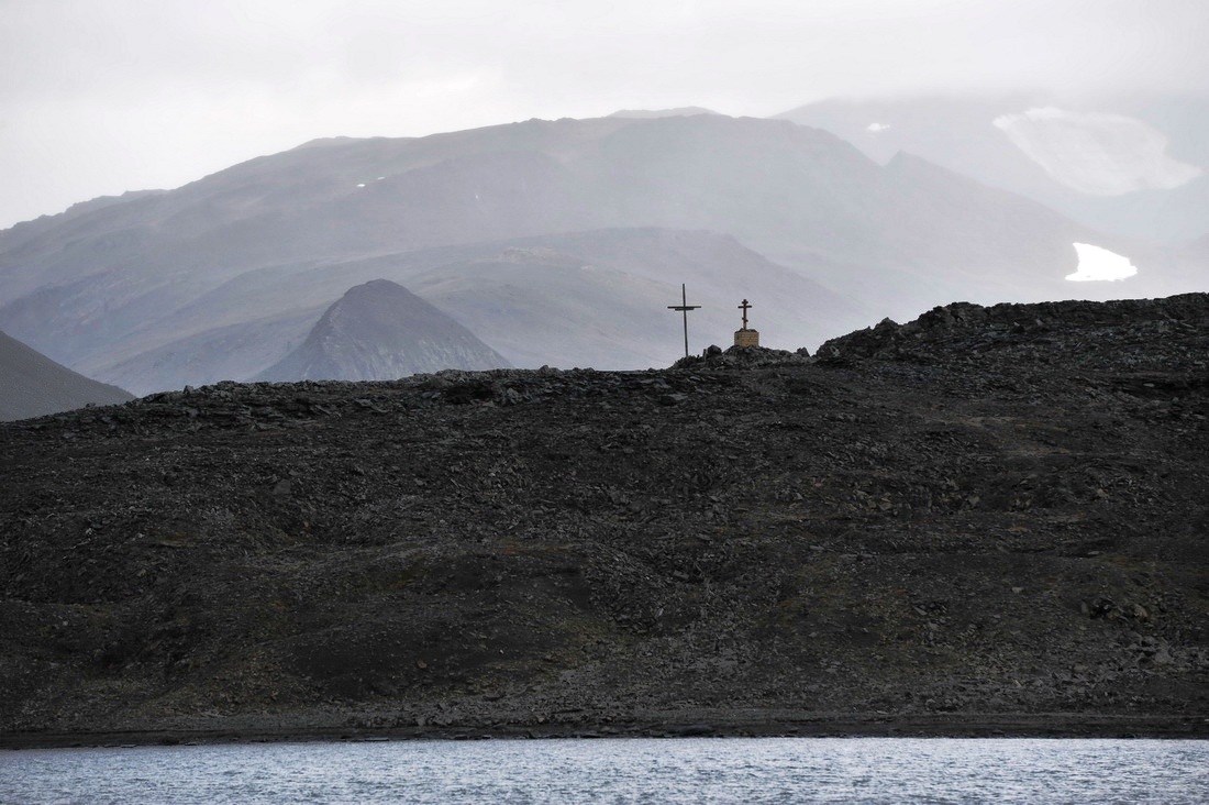 Окропляю крест святой водой: «Освящается крест сей!...» Склоняются знамёна пред скальными холмами могил героев Русской Арктики. Троекратный залп автоматчиков почетного караула; взмывают ввысь искрящиеся красные заряды сигнальных ракетниц; отданы воинские почести. Вечная память! Спите спокойно, верные сыны России!