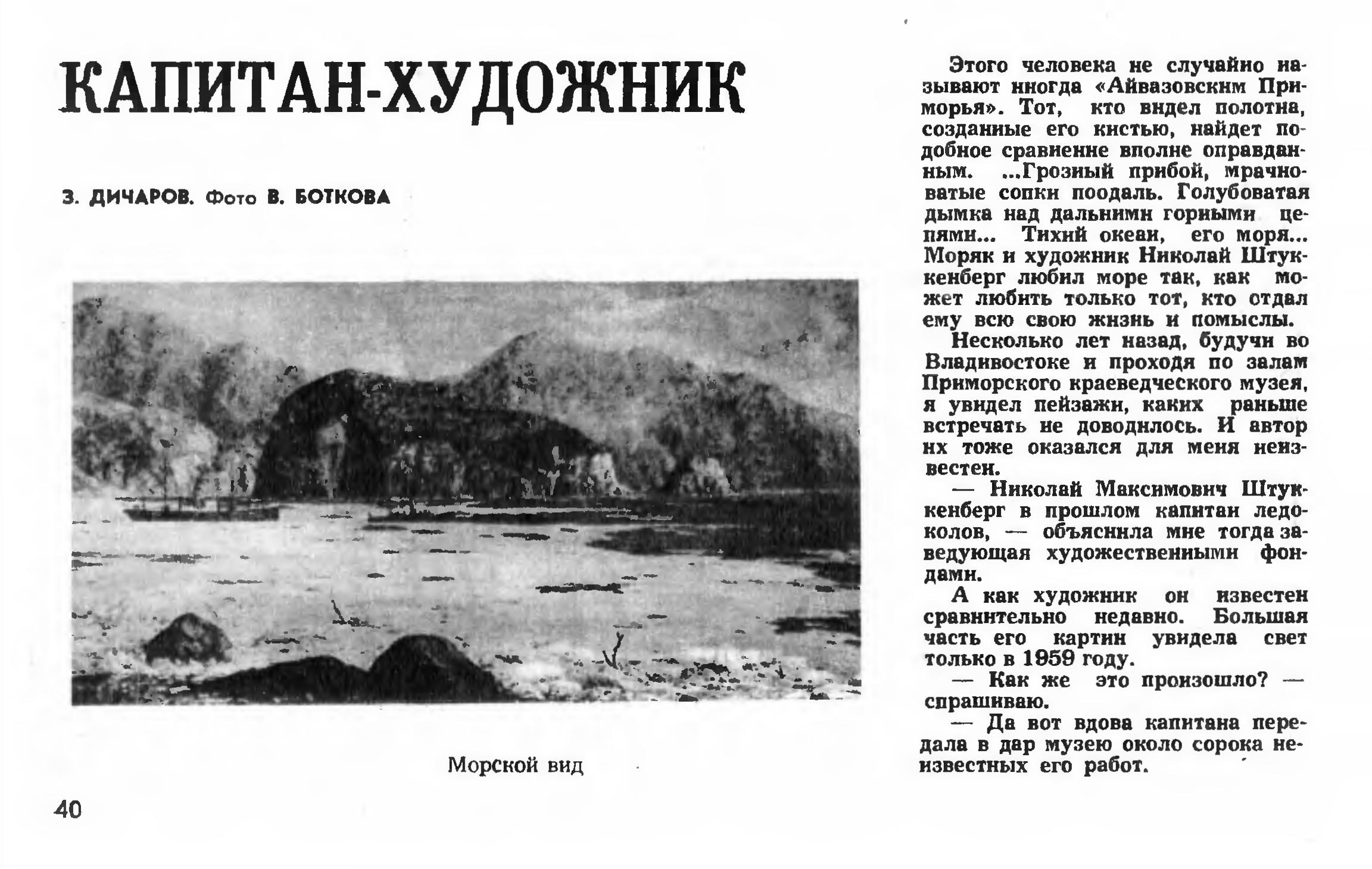 Этого человека не случайно называют иногда «Айвазовским Приморья». Тот, кто видел полотна, созданные его кистью, найдет подобное сравнение вполне оправданным. ...Грозный прибой, мрачноватые сопки поодаль. Голубоватая дымка над дальними горными цепями... Тихий океан, его моря... Моряк и художник Николай Штуккенберг любил море так, как может любить только тот, кто отдал ему всю свою жизнь и помыслы.