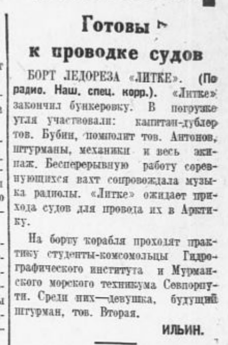 Ледокол под командой опытного капитана товарища КУПЕРШТРАССЕР направился к острову Диксон. Потом «Литке» пойдет в море Лаптевых с ледоколом «Ермак». «Литке» будет