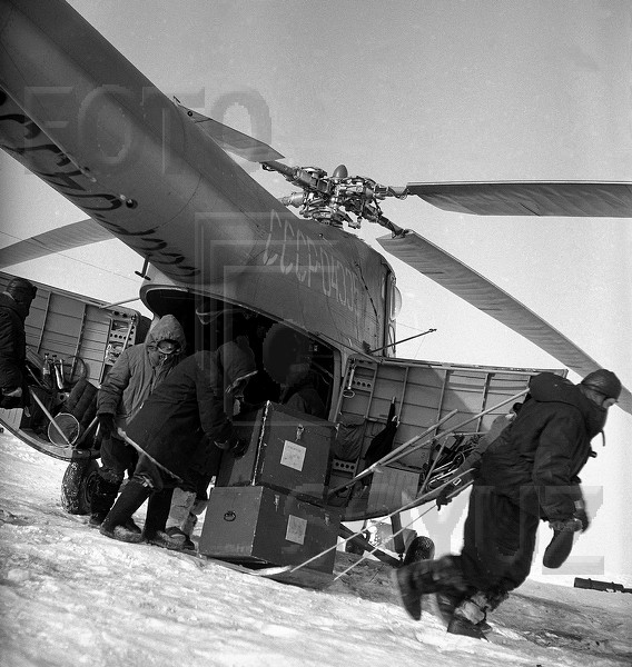 Арктика. Дрейфующая станция "Северный полюс-10". Разгрузка научного оборудования из вертолета. 1963