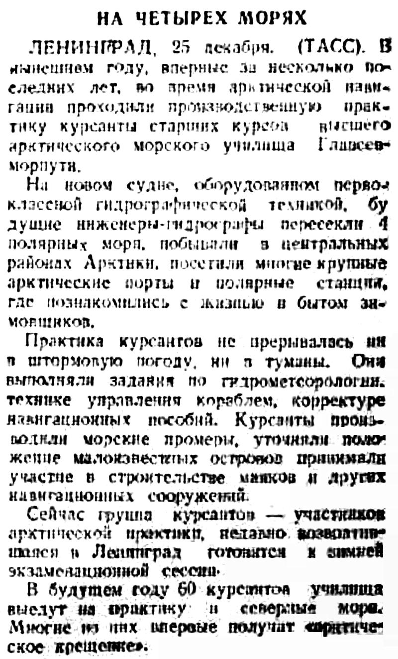 ЛЕНИНГРАД, 25 декабря. (ТАСС). В нынешнем году, впервые за несколько последних лет, во время арктической навигации проходили производственную практику курсанты старших курсов высшего арктического морского училища Главсевморпути.