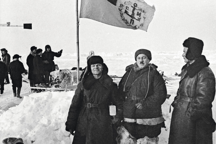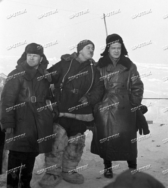 На фото: летчик Геннадий Власов, Папанин и начальник экспедиции по спасению папанинцев на ледоколе "Таймыр" Ананий Остальцев