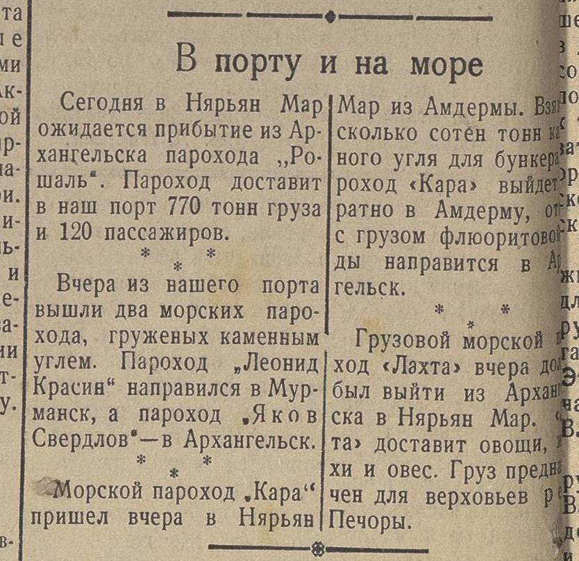 Заметка из газеты "Нарьяна-Вындер", № 258 (1983), от 14 ноября 1938 года (Ненецкий АО). К сожалению, пока по этому судну, ничего больше не нашёл. Может быть, это был эскадренный миноносец "Новик", который в 20-х годах переименовали в "Яков Свердлов", но судя по описаниям, он в это время находился на капитальном ремонте. 28 ноября 1937 года ветеран вновь возвратился для очередного ремонта (под заводским номером С-529) на место своего «рождения», в очередной раз переименованное: теперь бывшая Путиловская верфь, вошедшая в состав Наркомата оборонной промышленности, именовалась «Завод № 190 имени А.А.Жданова». И только в 40-м году ремонт был завершен. Может быть это было другое судно? А может он проходил испытание после ремонта в виде рейса до Амдермы и обратно?