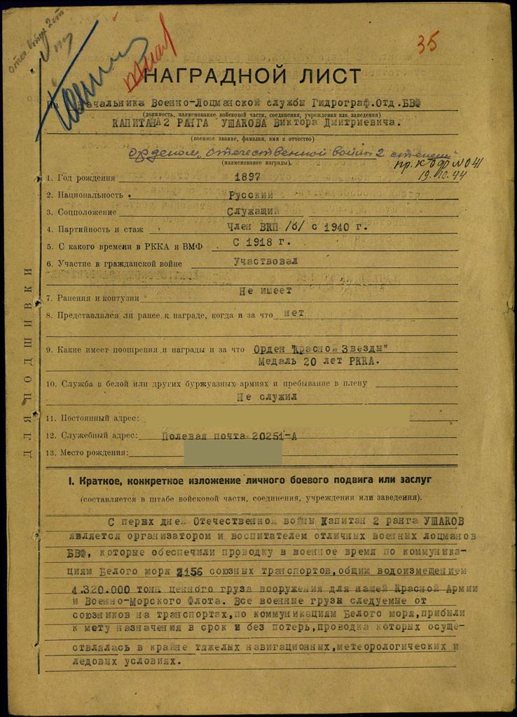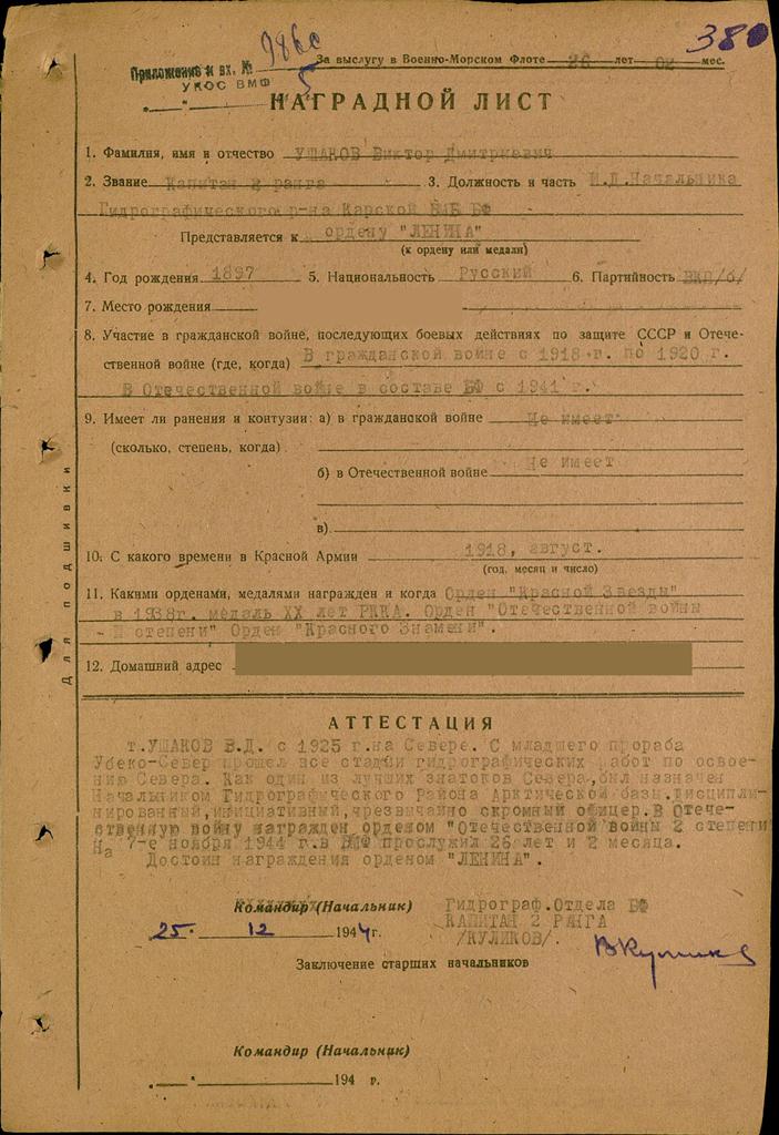 т. УШАКОВ В. Д. с 1925 года на Севере. С младшего прораба Убеко-Север прошел все стадии гидрографических работ по освоению Севера. Как один из лучших знатоков Севера, был назначен начальником Гидрографического района Арктической базы. Дисциплинированный, инициативный, чрезвычайно скромный офицер. В Отечественную войну награжден орденом "КРАСНАЯ ЗВЕЗДА". На 7 ноября 1944 года в ВМФ прослужил 26 лет и 2 месяца.