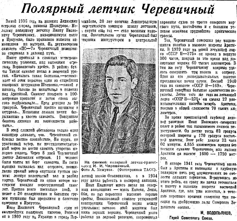 Полярный летчик ЧеревичныйЗимой 1936 года на далеких Ляховских островах сгорела зимовка Шелаурово. Молодому полярному летчику Ивану Ивановичу Черевичному, находившемуся тогда в Иркутске, было приказано вывезти зимовщиков на материк. На двухмоторном самолете «ПС—7» Черевичный немедленно стартовал в далекий путь.