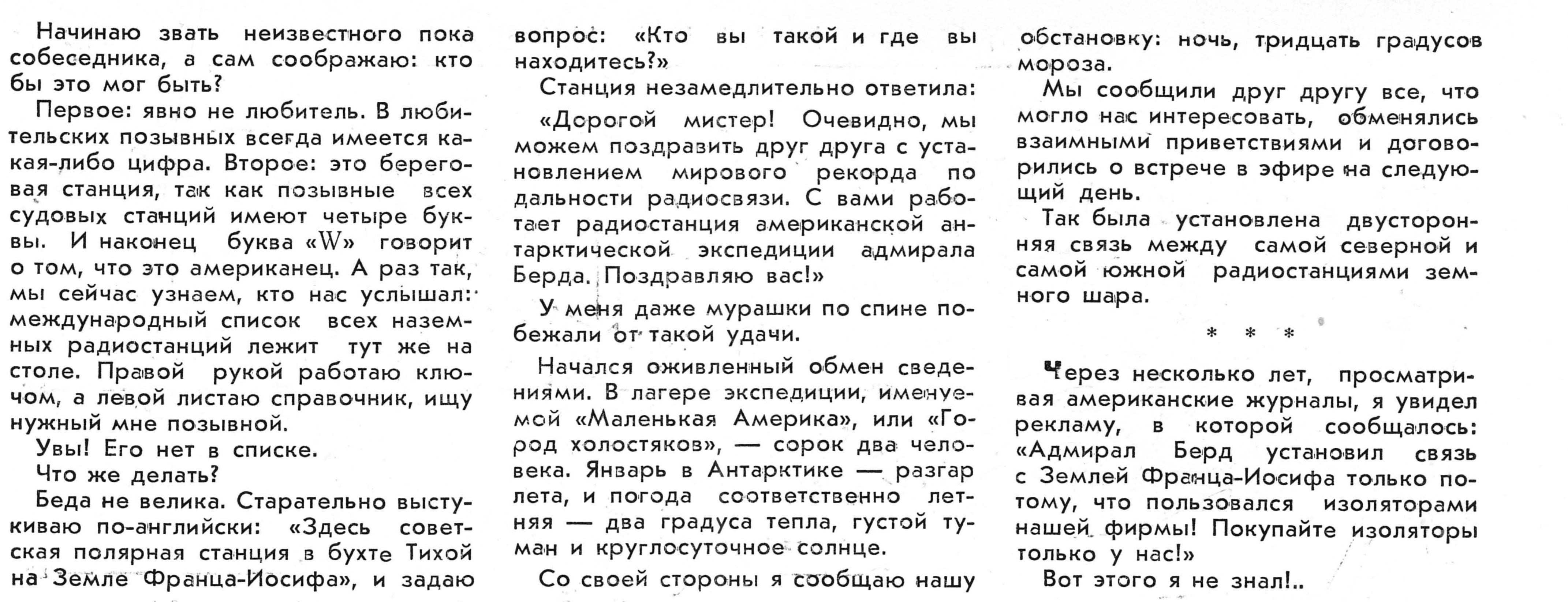 Через несколько лет, просматривая американские журналы, я увидел рекламу, в которой сообщалось: «Адмирал Берд установил связь с Землей Франца-Иосифа только потому, что пользовался изоляторами нашей, фирмы! Покупайте изоляторы только у нас! »