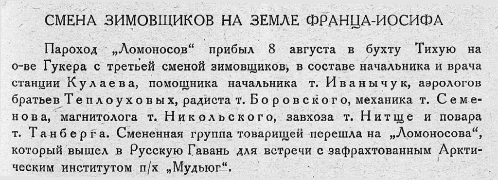 Пароход „Ломоносов" прибыл 8 августа в бухту Тихую на о-ве Гукера с третьей сменой зимовщиков, в составе начальника и врача станции Кулаева, помощника начальника т. Иванычук, аэрологов братьев Теплоуховых, радиста т. Боровского, механика т. Семенова, магнитолога т. Никольского, завхоза т. Нитще и повара т. Танберга. Смененная группа товарищей перешла на „Ломоносова", который вышел в Русскую Гавань для встречи с зафрахтованным Арктическим институтом п/х „Мудьюг".