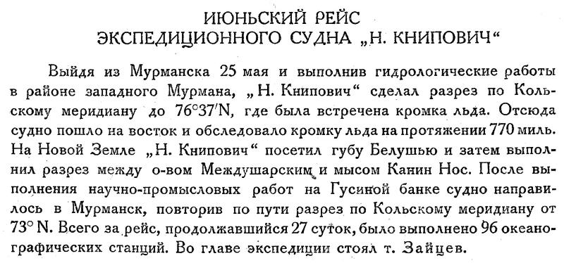 Участник! экспедиции рассказывают, что первый рейс "Николая Книпович" дал блестящие результаты, так как судну удалось, впервые ва все существование Биологической станции, дойти по Кольскому меридиану до 78° северной широты. Собран обильный и весьма ценный научный материал. Новое судно показало прекрасные качества корпуса, мотора и всего находящегося ва нем научного оборудования.