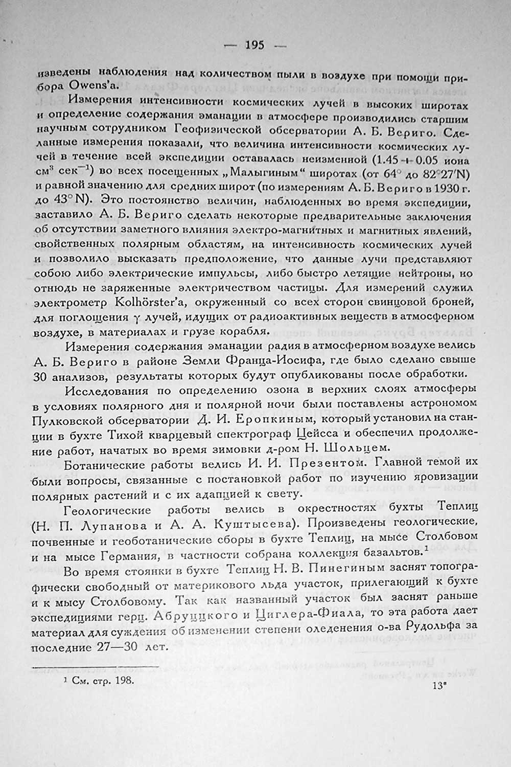 Измерения интенсивности космических лучей в высоких широтах и определение содержания эманации в атмосфере производились старшим научным сотрудником Геофизической обсерватории А. Б. Вериго. Сделанные измерения показали, что величина интенсивности космических лучен в течение всей экспедиции оставалась неизменной (1. 45 + 0. 05 иона см3 сек-1) во всех посещенных „Малыгиным" широтах (от 64°до 82°27'N) и равной значению для средних широт (по измерениям А. Б. Вериго в 1930 г. до 43°N). Это постоянство величин, наблюденных во время экспедиции, заставило А. Б. Вериго сделать некоторые предварительные заключения об отсутствии заметного влияния электро-магнитных и магнитных явлений) свойственных полярным областям, на интенсивность космических лучей и позволило высказать предположение, что данные лучи представляют собою либо электрические импульсы, либо быстро летящие нейтроны, но отнюдь не заряженные электричеством частицы. Для измерений служил электрометр Kolhorter’а, окруженный со всех сторон свинцовой броней, для поглощения у лучей, идущих от радиоактивных веществ в атмосферном воздухе, в материалах и грузе корабля.
