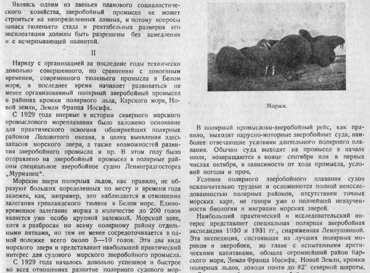 За 1934/35 г. по западному побережью, главным образом в южных становищах, из шкуры лысуна заготовлено 1876 м ремня. Случаев подхода моржа отмечено три: в конце сентября морж был у о-вов Пахтусова, в Русанове и в губе Митюшихе. Наблюдением установлено увеличение количества гнезд гаги в районе Митюшиха—Безымянная; так, например, на Большом Гагачьем о-ве, в губе Митюшихе, летом 1935 г. было найдено 500 гнезд, в то же время в 1934 г. там было найдено 240 гнезд, а в 1933 г. всего только 28 гнезд. Аналогичная картина встречается и на других гнездовьях гаги. Количество соби¬раемого пуха артелью возрастает из года в год.