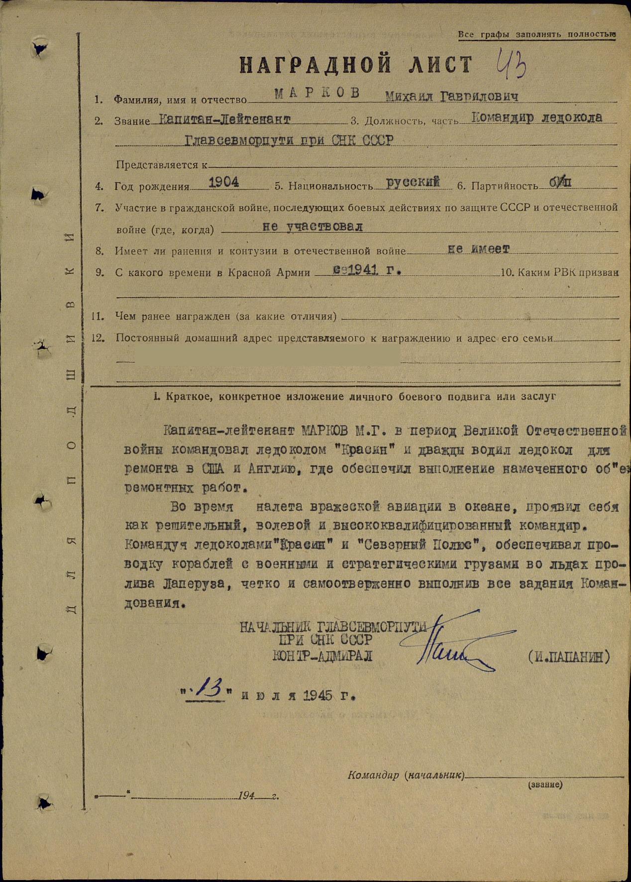 Какой бы сложной ни складывалась обстановка, Марков всегда был спокоен и решителен. Высокое мастерство ледокольщика, доброта, общительность вызывали к нему всеобщее и самое искреннее уважение».