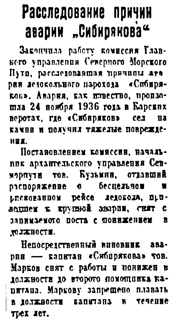 Закончила работу комиссия Главного управления Северного Морского Пути, расследовавшая причины аварии ледокольного парохода «Сибиряков». Авария, как известно, произошла 24 ноября 1936 года в Карских воротах, где «Сибиряков» сел на камни и получил тяжелые повреждения.