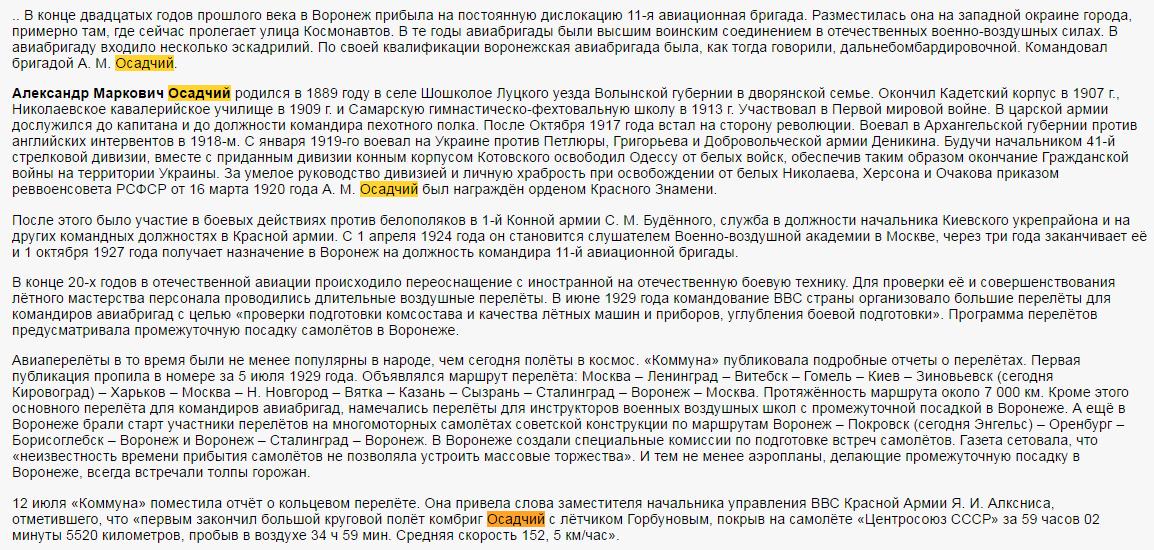 http://www.proza.ru/2016/02/21/2001269. ОСАДЧИЙ Александр Маркович (1889, с. Шошколое Луцкого уезда Волынской губ. – погиб 29.6.1930, близ Саратова, захоронен на пл. 3-го Интернационала Воронеж) комдив (1921), командовал Железной дивизией (1921-23); командир 11-ой Авиабригады (1.10.27-29.3.30), состояла из трёх эскадрилий – всего 30 бомбардиров (1923-30).