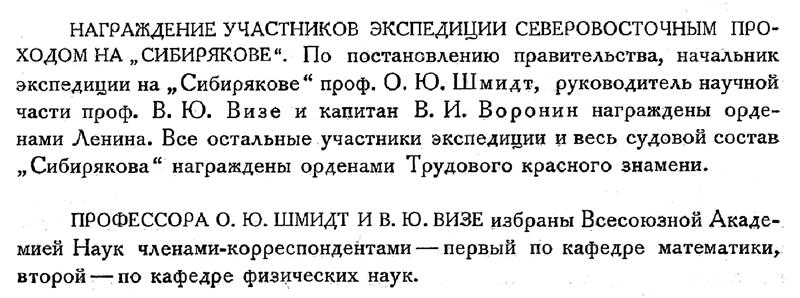 НАГРАЖДЕНИЕ УЧАСТНИКОВ ЭКСПЕДИЦИИ СЕВЕРОВОСТОЧНЫМ ПРОХОДОМ НА „СИБИРЯКОВЕ". По постановлению правительства, начальник экспедиции на „Сибирякове" проф. О. Ю. Шмидт, руководитель научной части проф. В. Ю. Визе и капитан В. И. Воронин награждены орденами Ленина. Все остальные участники экспедиции и весь судовой состав „Сибирякова“ награждены орденами Трудового красного знамени.