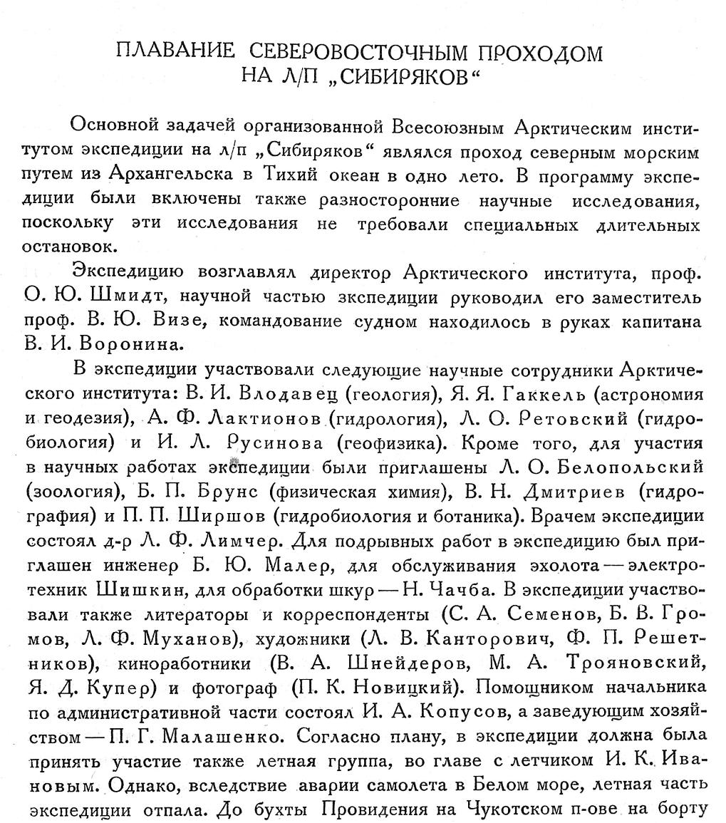 Основной задачей организованной Всесоюзным Арктическим институтом экспедиции на л/п „Сибиряков“ являлся проход северным морским путем из Архангельска в Тихий океан в одно лето. В программу экспедиции были включены также разносторонние научные исследования, поскольку эти исследования не требовали специальных длительных остановок.