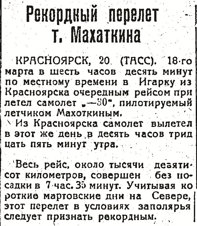 Прибыл в Красноярск 5.6.1935. С-т был готов только 22.6.35. 24 июня экипаж: я, 2п Бубнов Г.Д., механики Ивашина, его помощник Афинендульев и работник Аэрографии … вылетел в Дудинку для дальнейших полётов в тундру.