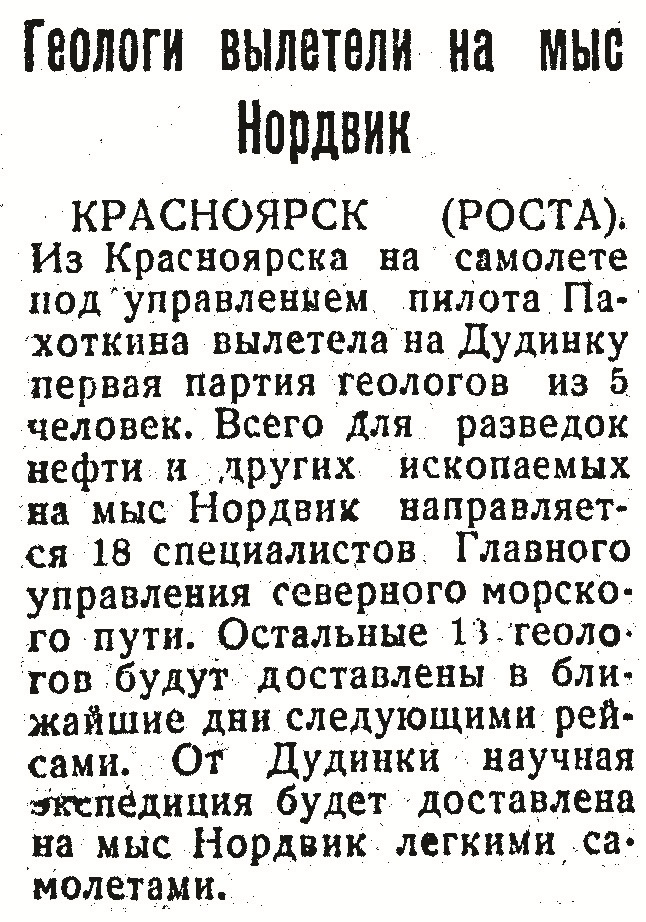3. Начальнику Ленской авиалинии – для оказания помощи «РД» в момент его полёта в районе моря Лаптевых и в районе к востоку от р. Лены до истоков Колымы выделить: в б. Тикси самолёт МП6 Н-29 пилота Черевичного. Держать наготове на участке Якутск-Булун самолёт П6 Ж-1 пилота Крузе и 3-й самолёт – в самом Якутске.