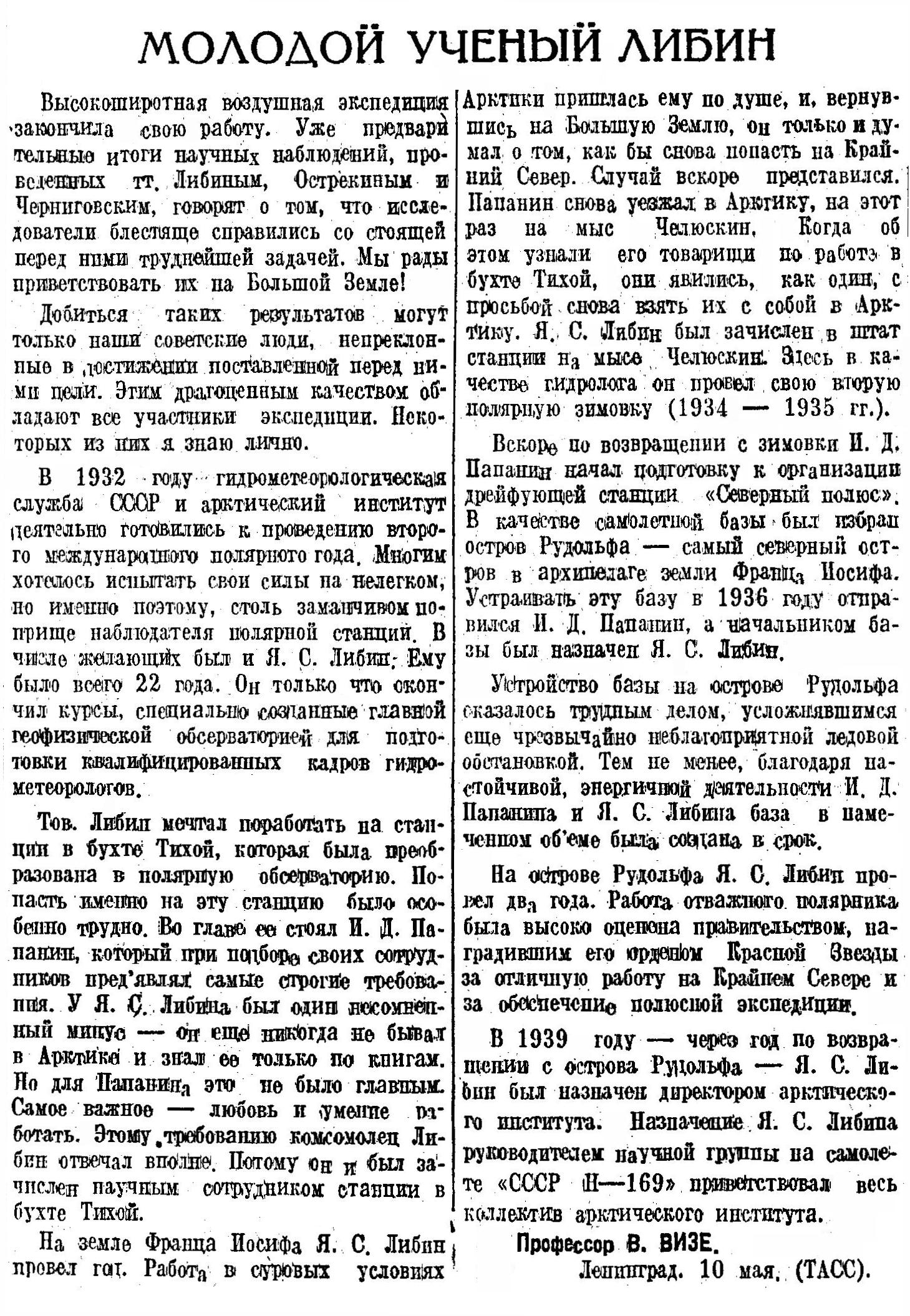 МОЛОДОЙ УЧЕНЫЙ ЛИБИНВысокоширотная воздушная экспедиция закончила свою работу. Уже предварительные итоги научных наблюдений, проведенных тт. Либиным, Острекинын и Черниговским, говорят о том, что исследователи блестяще справились со стоящей перед ними труднейшей задачей. Мы рады приветствовать их на Большой Земле!