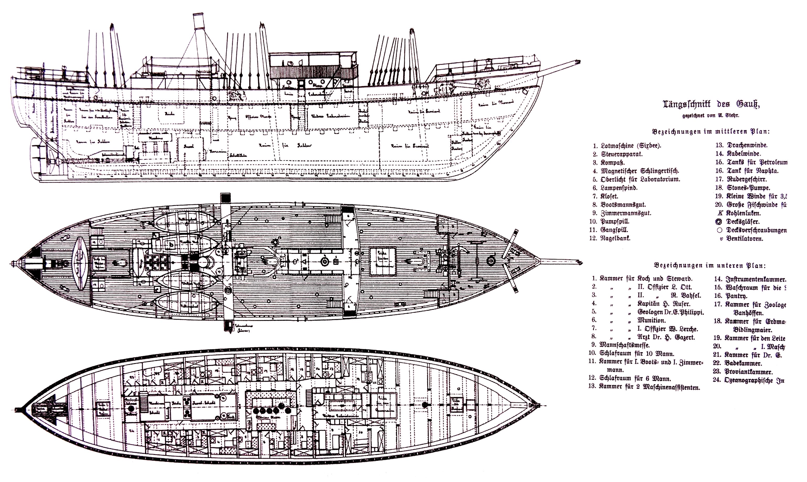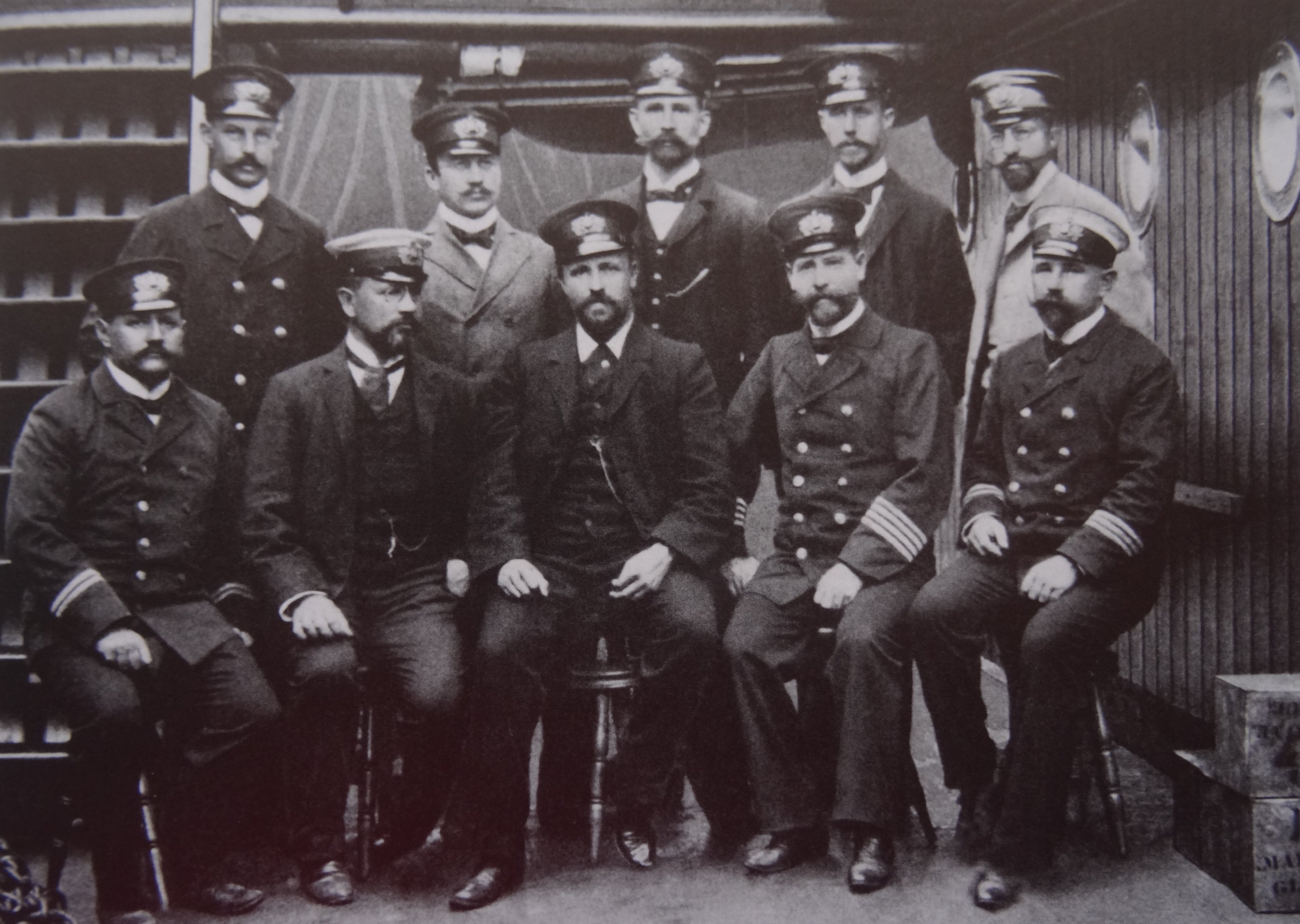 Офицерский и экспедиционный состав. Задний ряд, слева направо: Отт, Бидлингмайер, Верт, Гарцерт, Филиппи. Передний ряд, слева направо: Вазель, Ванхоффен, Дригальский, Рюсер (капитан судна), Лерхе.