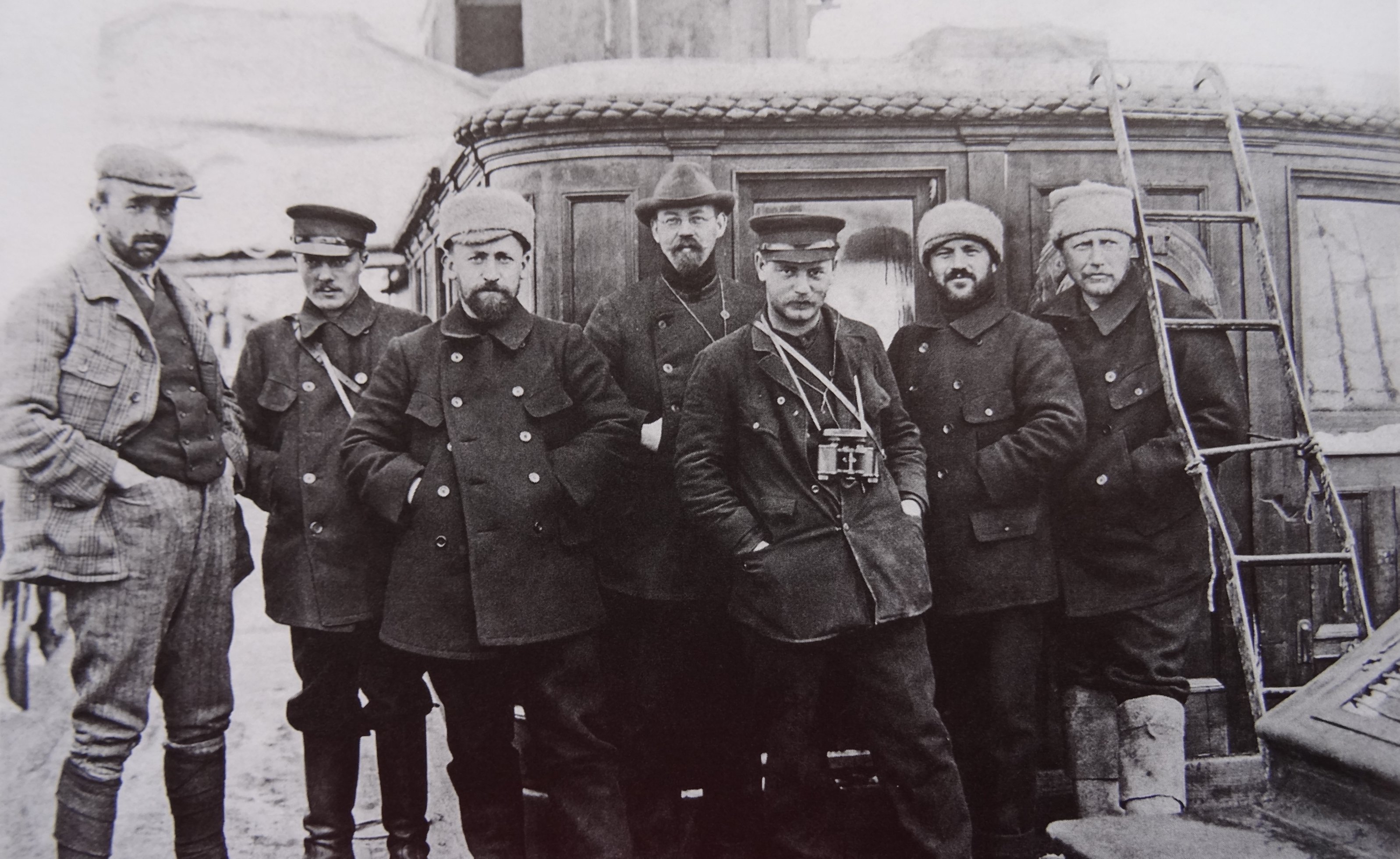 На крыльце магистрата Южной Георгии в Грютвикене, на обратном пути в Европу. Крайний слева в заднем ряду - Лоренцен. Первый ряд слева направо: Хайм, Мюллер, Барков.