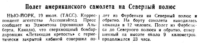 НЬЮ-ЙОРК, 19 июля. (ТАСС). Корреспондент агентства Ассошиэйтед Пресс сообщает из Эдмонтона (провинция Альберта, Канада), что сверхмощный бомбардировщик "Летающая крепость" с герметически закрытой кабиной совершил полет из Фербенкса на Северный полюс и обратно. На борту самолета находилась команда в 12 человек. Полет из Фербенкса до Северного полюса и обратно, совершенный на высоте около 9 километров продолжался 23 часа.