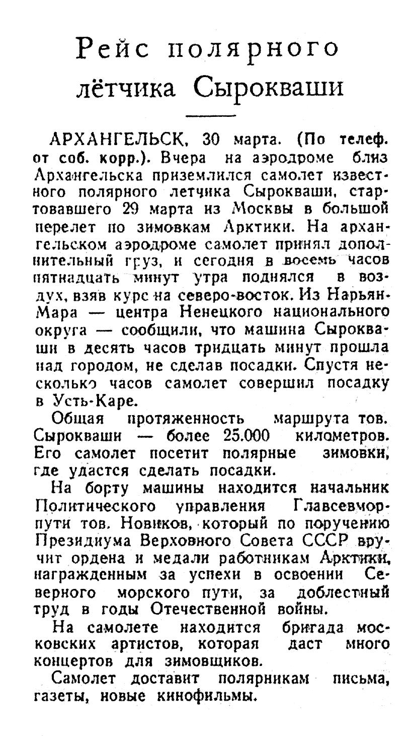 АРХАНГЕЛЬСК, 30 марта. (По телеф. от соб. корр.). Вчера на аэродроме близ Архангельска приземлился самолет известного полярного летчика Сырокваши, стартовавшего 29 марта из Москвы в большой перелет по зимовкам Арктики. На архангельском аэродроме самолет принял дополнительный груз, и сегодня в восемь часов пятнадцать минут утра поднялся в воздух, взяв курс на северо-восток. Из Нарьян-Мара — центра Ненецкого национального округа — сообщили, что машина Сырокваши в десять часов тридцать минут прошла над городом, не сделав посадки. Спустя несколько часов самолет совершил посадку в Усть-Каре.
