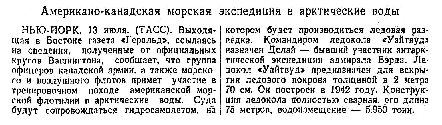 НЬЮ-ЙОРК, 13 июля. (ТАСС). Выходящая в Бостоне газета «Геральд», ссылаясь на сведения, полученные от официальных кругов Вашингтона, сообщает, что группа офицеров канадской армии, а также морского и воздушного флотов примет участие в тренировочном походе американской морской флотилии в арктические воды. Суда будут сопровождаться гидросамолетом, на котором будет производиться ледовая разведка. Командиром ледокола «Уайтвуд» назначен Делай — бывший участник антарктической экспедиции адмирала Бэрда. Ледокол «Уайтвуд» предназначен для вскрытия ледового покрова толщиной в 2 метра 70 см. Он построен в 1942 году. Конструкция ледокола полностью сварная, его длина 75 метров, водоизмещение — 5.950 тонн.
