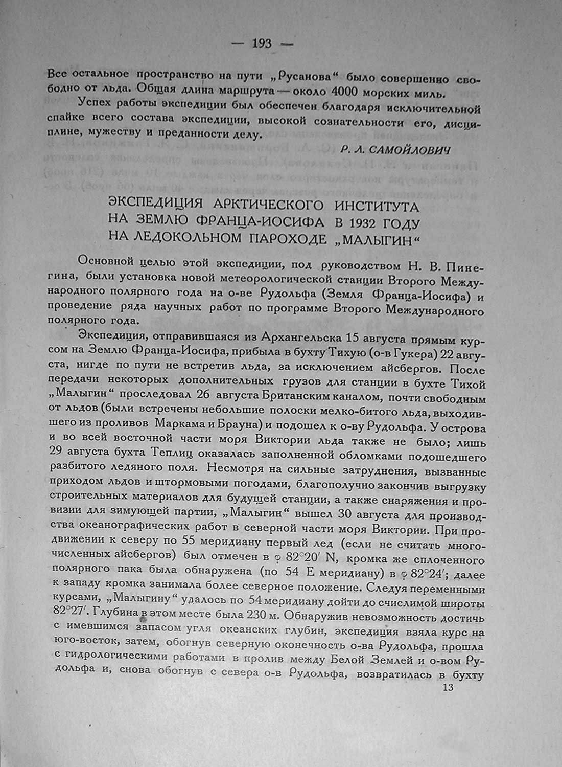 ЭКСПЕДИЦИЯ АРКТИЧЕСКОГО ИНСТИТУТА НА ЗЕМЛЮ ФРАНЦА-ИОСИФА В 1932 ГОДУ НА ЛЕДОКОЛЬНОМ ПАРОХОДЕ „МАЛЫГИН"Основной целью этой экспедиции, под руководством Н. В. Пинегина, были установка новой метеорологической станции Второго Международного полярного года на о-ве Рудольфа (Земля Франца-Иосифа) и проведение ряда научных работ по программе Второго Международного полярного года.