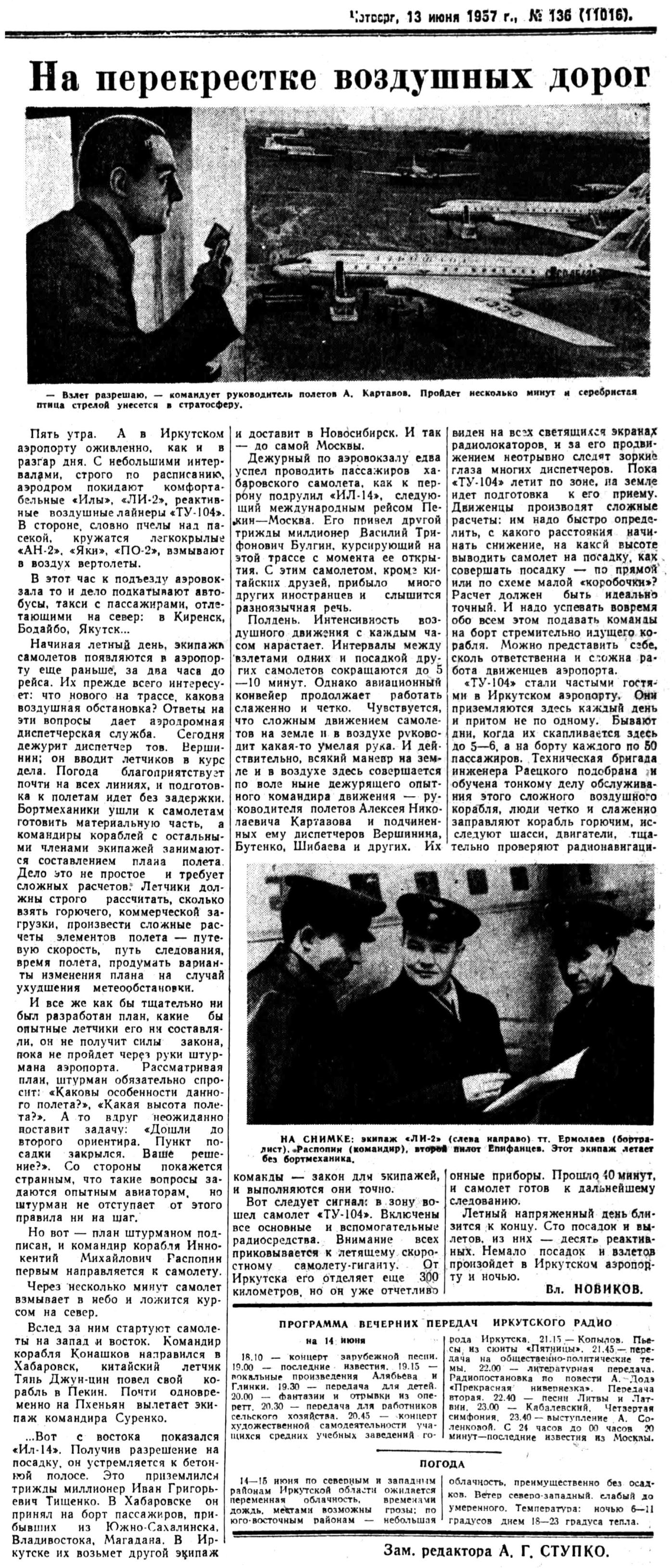 ...Вот с востока показался «Ил-14». Получив разрешение на посадку, он устремляется к бетон-гой полосе. Это приземлился трижды миллионер Иван Григорьевич Тищенко. В Хабаровске он принял на борт пассажиров, прибывших из Южно-Сахалинска, Владивостока, Магадана. В Иркутске их возьмет другой экипаж и доставит в Новосибирск. И так — до самой Москвы.