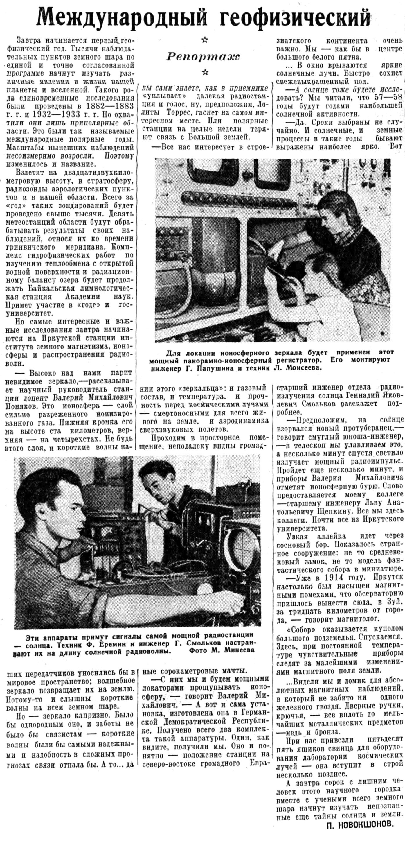 — В этот важный в истории науки момент по всей землей тысячи наблюдателей приступают к ответственной работе по выполнению программы Международного геофизического года.