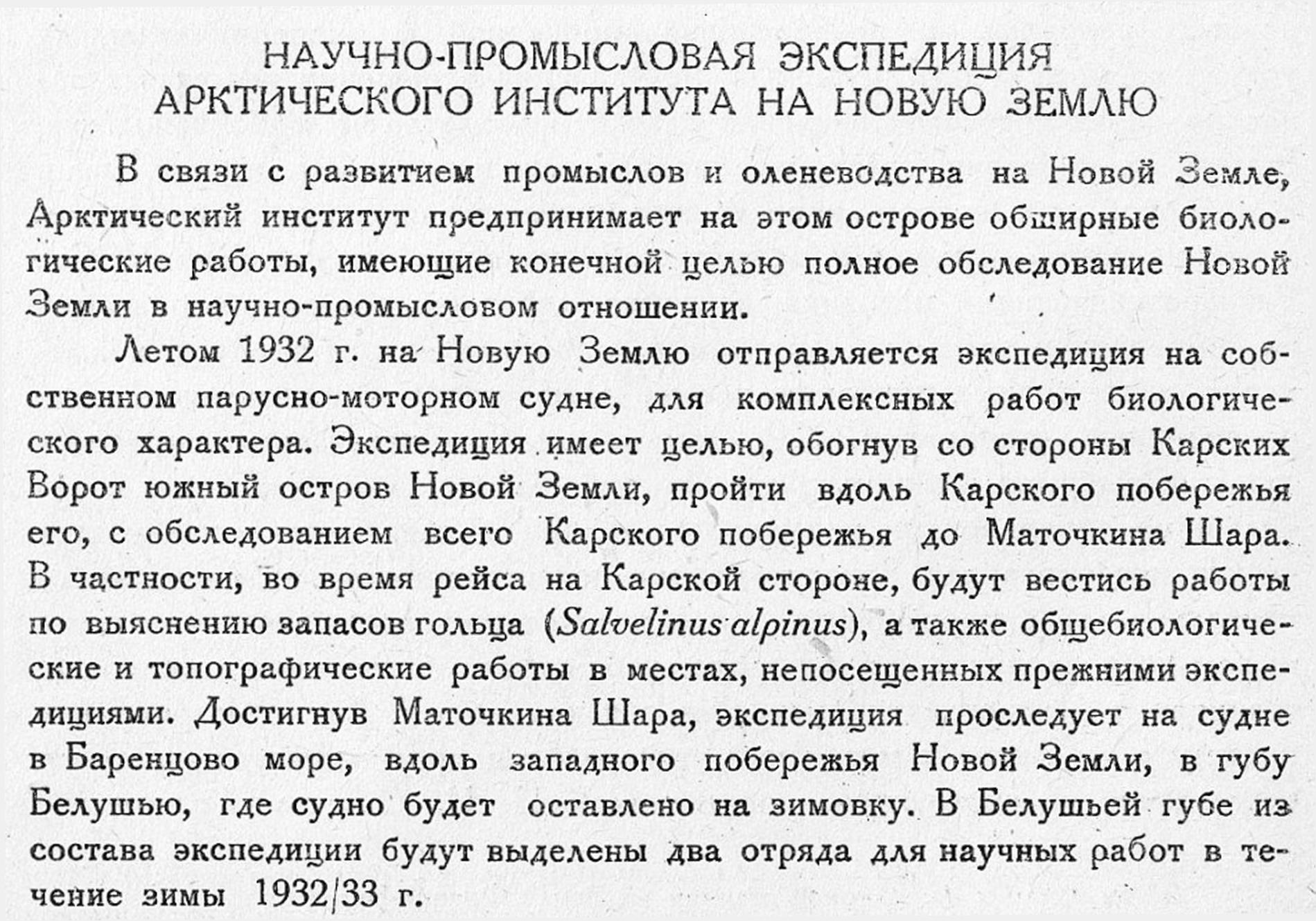 Летом 1932 г. на Новую Землю отправляется экспедиция на собственном парусно-моторном судне, для комплексных работ биологического характера. Экспедиция имеет целью, обогнув со стороны Карских Ворот южный остров Новой Земли, пройти вдоль Карского побережья его, с обследованием всего Карского побережья до Маточкина Шара. В частности, во время рейса на Карской стороне, будут вестись работы по выяснению запасов гольца (Salvelinus alpinus), а также общебиологические и топографические работы в местах, непосещенных прежними экспедициями. Достигнув Маточкина Шара, экспедиция проследует на судне в Баренцово море, вдоль западного побережья Новой Земли, в губу Белушью, где судно будет оставлено на зимовку. В Белушьей губе из состава экспедиции будут выделены два отряда для научных работ в течение зимы 1932/33 г.