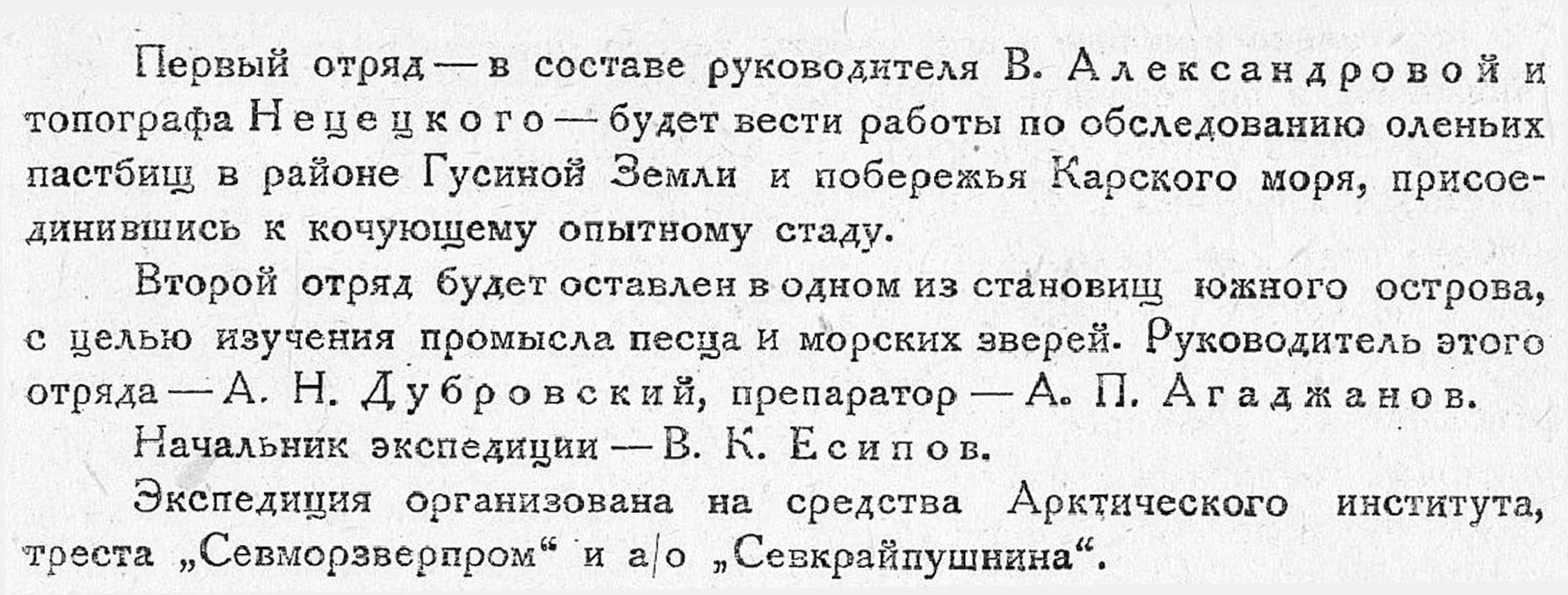 Первый отряд — в составе руководителя В. Александровой и топографа Нецецкого — будет вести работы по обследованию оленьих пастбищ в районе Гусиной Земли и побережья Карского моря, присоединившись к кочующему опытному стаду.