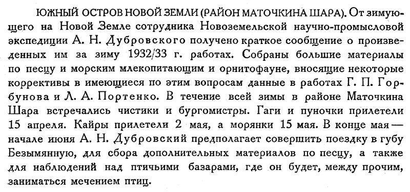 ЮЖНЫЙ ОСТРОВ НОВОЙ ЗЕМЛИ (РАЙОН МАТОЧКИНА ШАРА). От зимующего на Новой Земле сотрудника Новоземельской научно-промысловой экспедиции А. Н. Дубровского получено краткое сообщение о произведенных им за зиму 1932/33 г. работах. Собраны большие материалы по песцу и морским млекопитающим и орнитофауне, вносящие некоторые коррективы в имеющиеся по этим вопросам данные в работах Г. П. Горбунова и Л. А. Портенко. В течение всей зимы в районе Маточкина Шара встречались чистики и бургомистры. Гаги и пуночки прилетели 15 апреля. Кайры прилетели 2 мая, а морянки 15 мая. В конце мая — начале июня А. Н. Дубровский предполагает совершить поездку в губу Безымянную, для сбора дополнительных материалов по песцу, а также для наблюдений над птичьими базарами, где он будет, между прочим, заниматься мечением птиц.